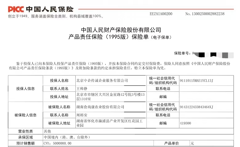 产品质量是企业生存与发展的基石,为消费者提供优质、安全、放心的产品是企业义不容辞的责任。随着消费水平的持续升级,市场对高品质产品的需求日益增长。为进一步强化产品质量保障、提升消费信心,湖南食尚康农业股份有限公司与中国人民财产保险股份有限公司达成合作,为全线产品投保产品责任险,为企业和消费者增添一份坚实保障。