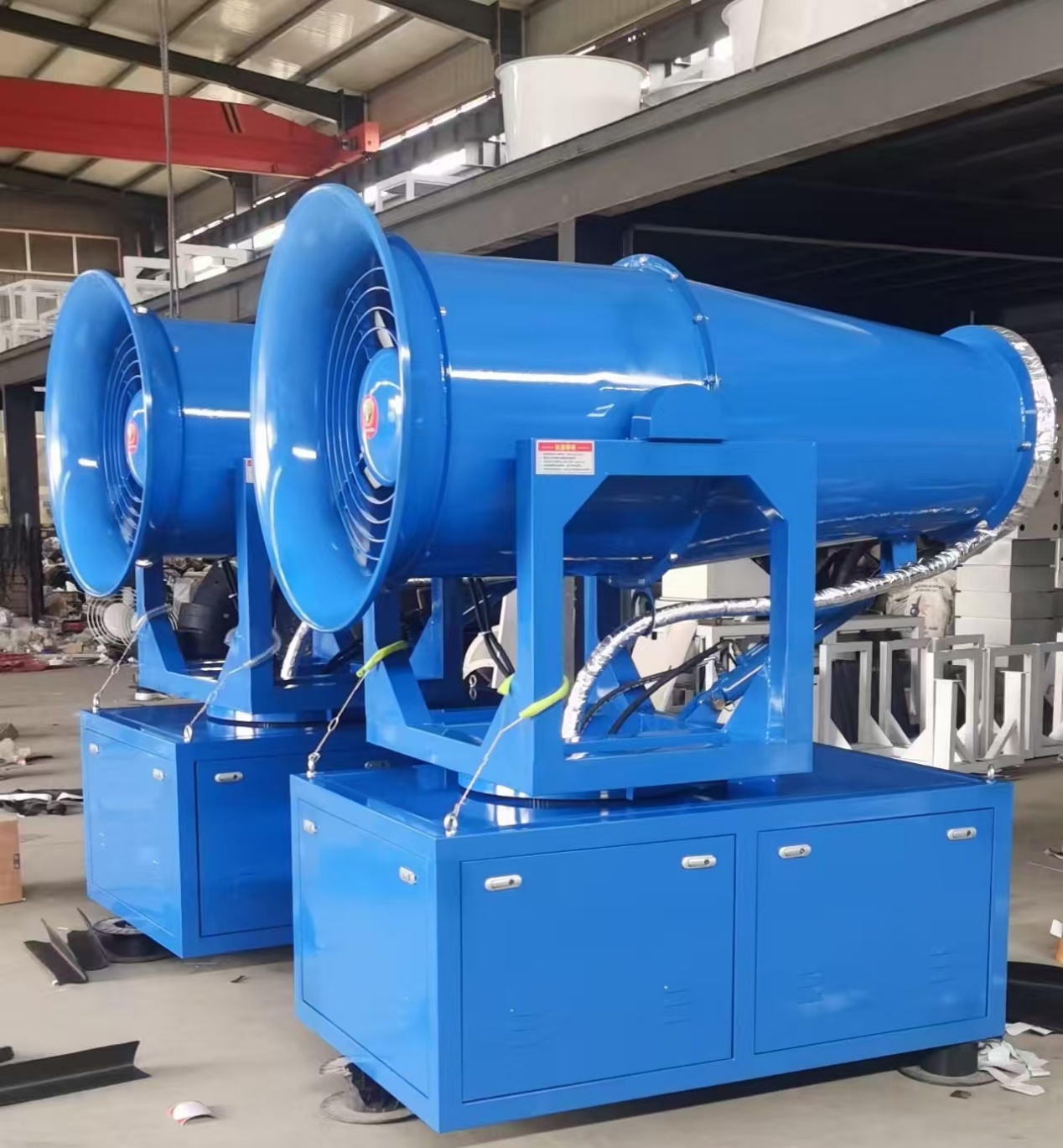 上图是雾炮机,雾炮机通过喷射超细水雾,能高效吸附空气中的粉尘颗粒并实现快速沉降,起到显著的降尘和局部降温作用。它具有覆盖范围广、除尘效率高且耗水量少的优点,广泛应用于工地、矿场.电厂等易产生粉尘的开放场所。