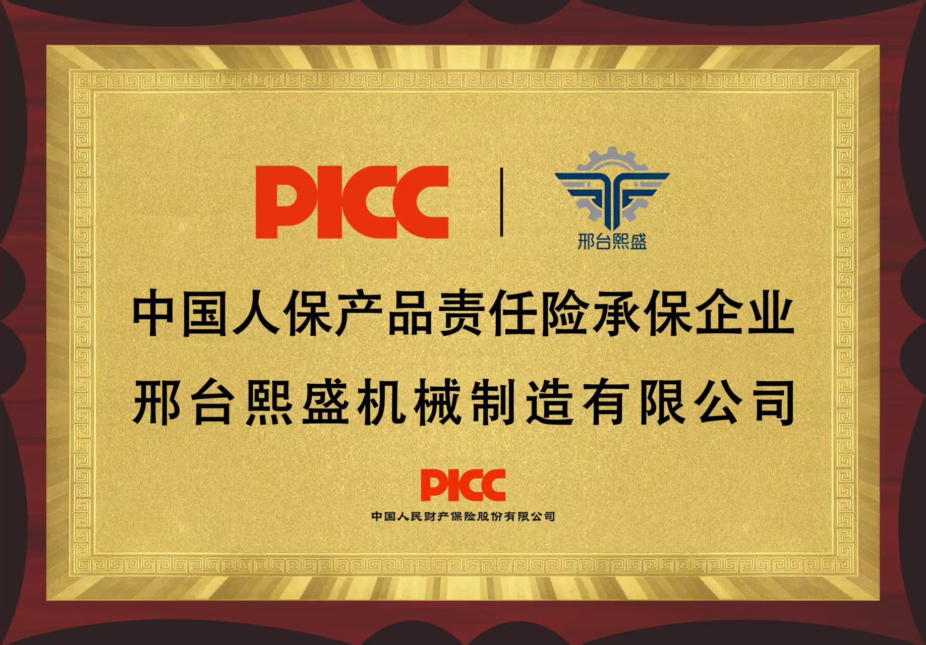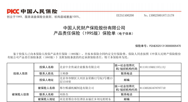 本次邢台熙盛机械制造有限公司旗下系列产品,顺利通过中国人保审核,为企业全线产品承保产品责任险,证明公司产品的真实、合格,也标志着邢台熙盛机械制造有限公司为消费者提供安全保障的决心。