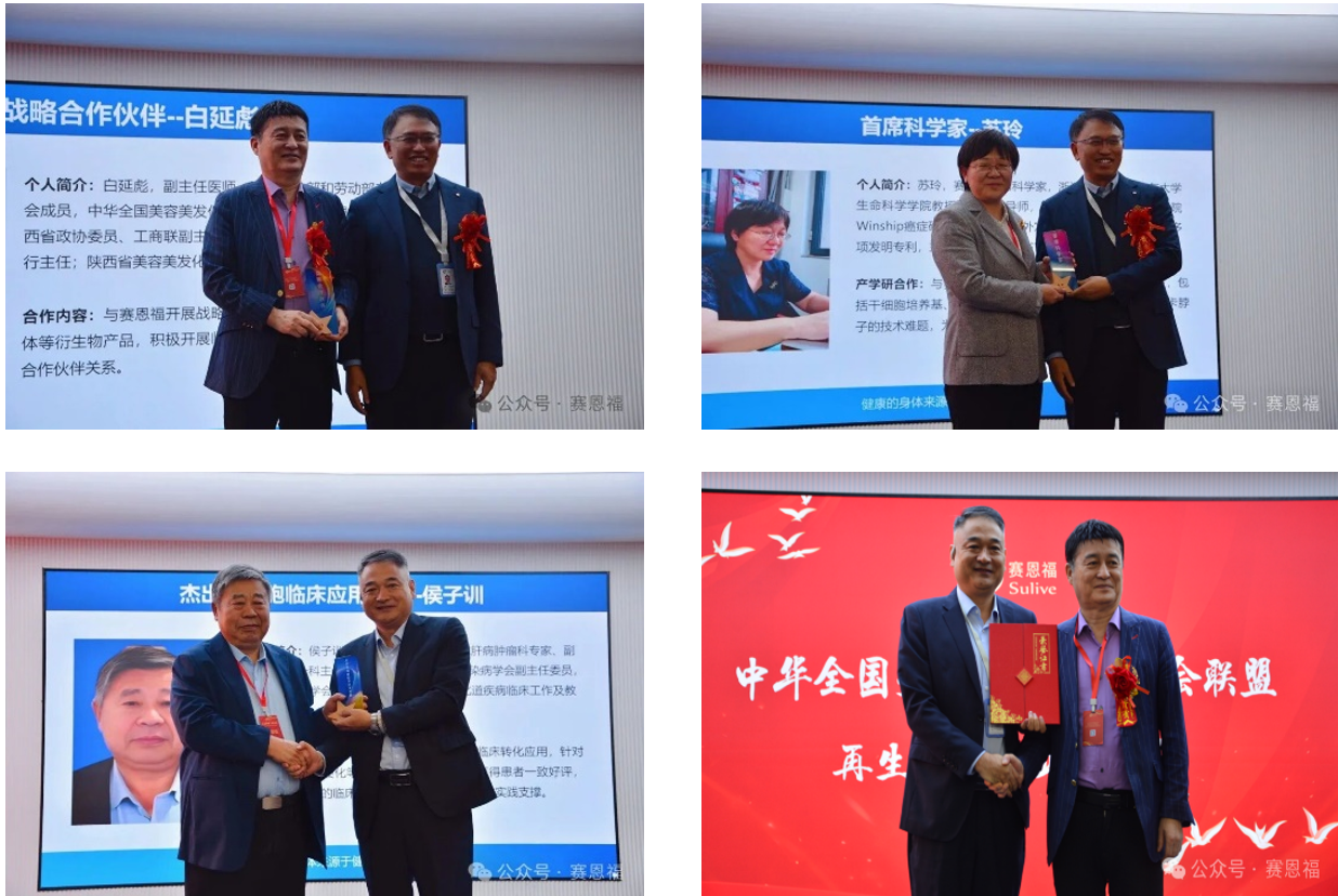 活动最后,荣誉时刻如期而至:邓长江董事长与尚现岗总经理共同为三名首席专家、战略合伙人及干细胞临床应用专家颁发荣誉奖项,以表彰他们为行业与企业发展做出的贡献;随后,中华全国美容化妆品协商会联盟再生医学专委会代表上台为赛恩福授牌,这一荣誉不仅是对企业实力的肯定,更是对其在再生医学领域影响力的认可。