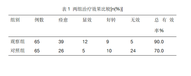 观察组临床治疗总有效率为90.0%,对照组为70.0%,两组差异显著,具体结果见表1。
