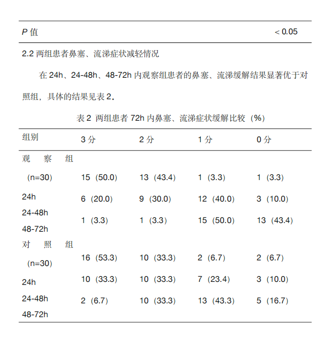 在24h、24-48h、48-72h内观察组患者的鼻塞、流涕缓解结果显著优于对照组,具体的结果见表2。