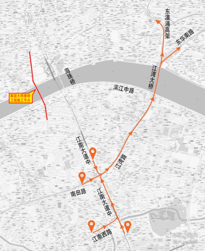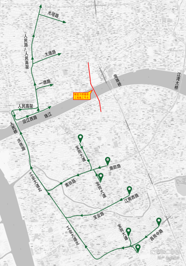小客车可前往江湾大桥、人民桥、海珠桥、海印桥绕行。