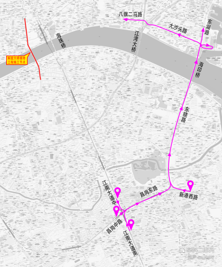 施工期间,解放大桥禁止车辆和行人通行。同时,周边路网交通组织将进行临时调整,解放南路南行车辆将禁止左转进入一德路,前往一德路的车辆需从沿江西路处掉头。