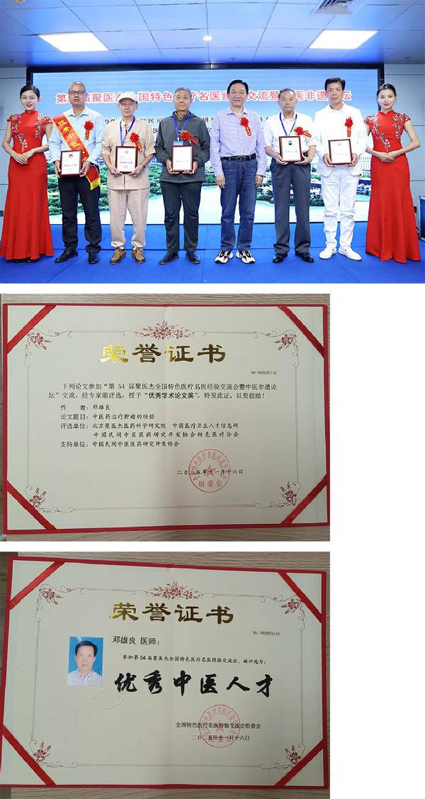 其一,他的论文《中医药治疗肿瘤的经验》经北京聚医杰中医药科学研究院、中国医疗卫生人才信息网等评选单位的专家组严格评审,从众多学术论文中脱颖而出,荣获“优秀学术论文奖”。该论文系统总结了邓雄良医师多年来的肿瘤诊疗经验,既有理论创新,又有临床实证,充分体现了其学术水平与科研能力。