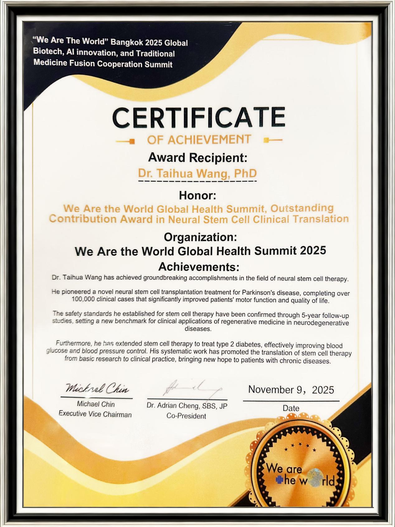 其中,赛尔生物集团董事长王泰华博士凭借在生物科研领域的创新突破与国际影响力,荣获大会颁发的“神经干细胞临床转化杰出贡献奖”,这一殊荣不仅是对王博士个人临床科研成就的高度肯定,更彰显了赛尔集团在生命科学领域的专业实力。