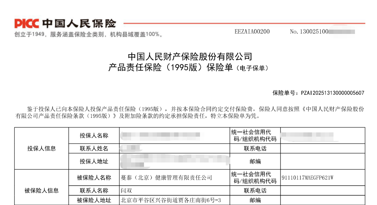 本次蔓泰(北京)健康管理有限责任公司旗下全系列产品承保产品责任险,标志着蔓泰(北京)健康管理有限责任公司为消费者提供产品安全保障的决心。