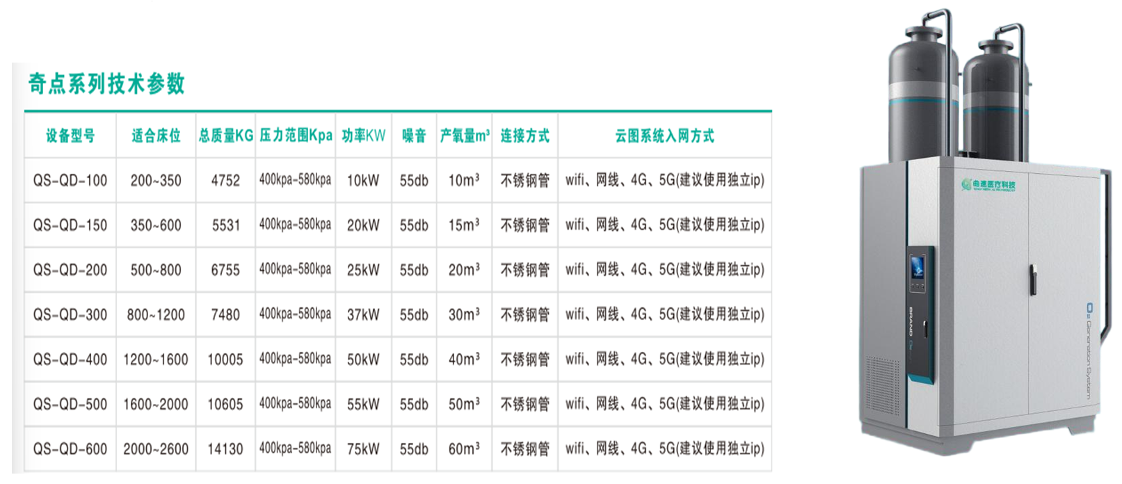 针对中小型医疗机构:公司推出的“光速一体机系列”,共四个型号;QS-GS-012/QS-QD-030/050/100;采用锂基分子筛等创新技术,具备氧浓度提升快、占地面积小、运行噪音低、即插即用等优点,有效破解了传统供氧模式能耗高、维护难的问题,完美适配社区医院、乡镇卫生院等场景。